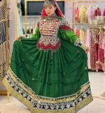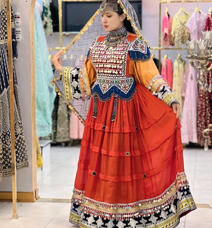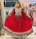 Celebrate Afghan heritage with this stunning traditional dress, available in three vibrant color options: radiant red, emerald green, and bold orange. Each dress is beautifully adorned with intricate embroidery, mirrored embellishments, and metallic coin detailing, showcasing the richness of Afghan craftsmanship. The full-tiered skirt and patterned bodice are complemented by long sleeves and a matching headpiece, making this outfit perfect for cultural events, celebrations, or showcasing timeless artistry.
