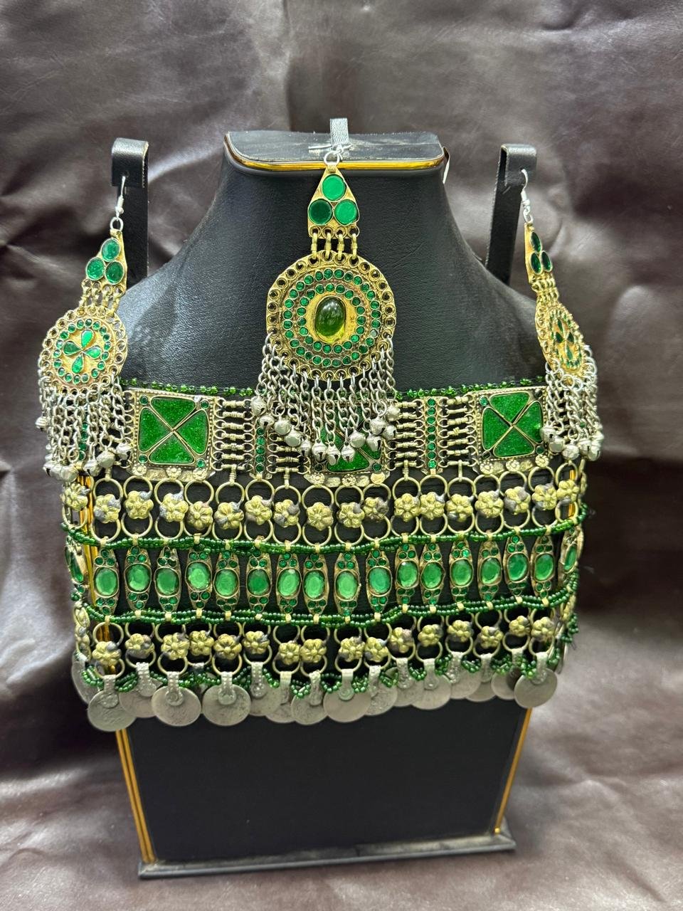 This stunning jewelry set is distinguished by its use of traditional Afghan motifs, often incorporating materials like coins, beads, and stones. Each piece tells a story, making it not just an accessory, but a connection to history and culture.