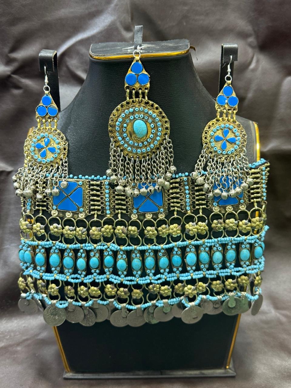 This stunning jewelry set is distinguished by its use of traditional Afghan motifs, often incorporating materials like coins, beads, and stones. Each piece tells a story, making it not just an accessory, but a connection to history and culture.