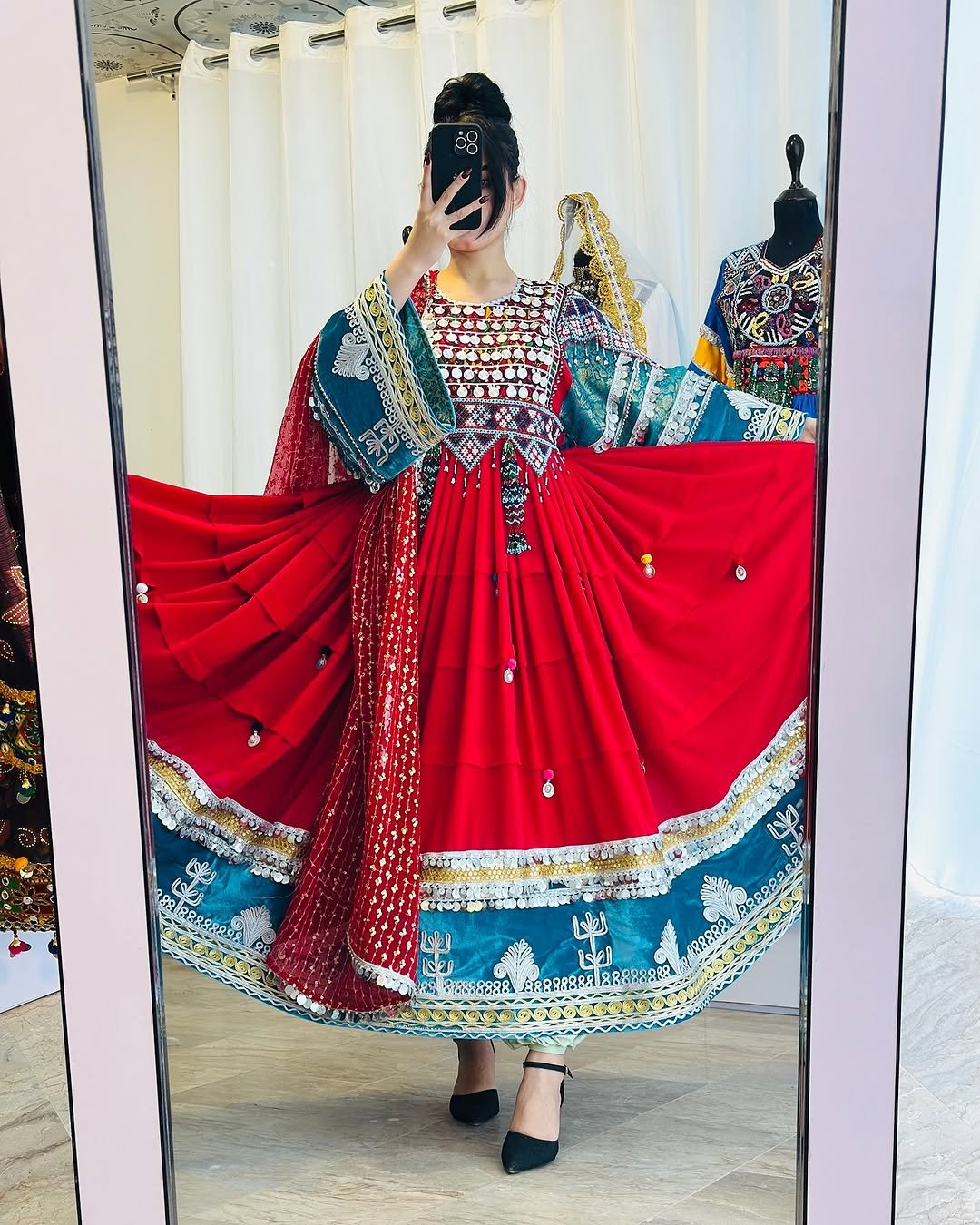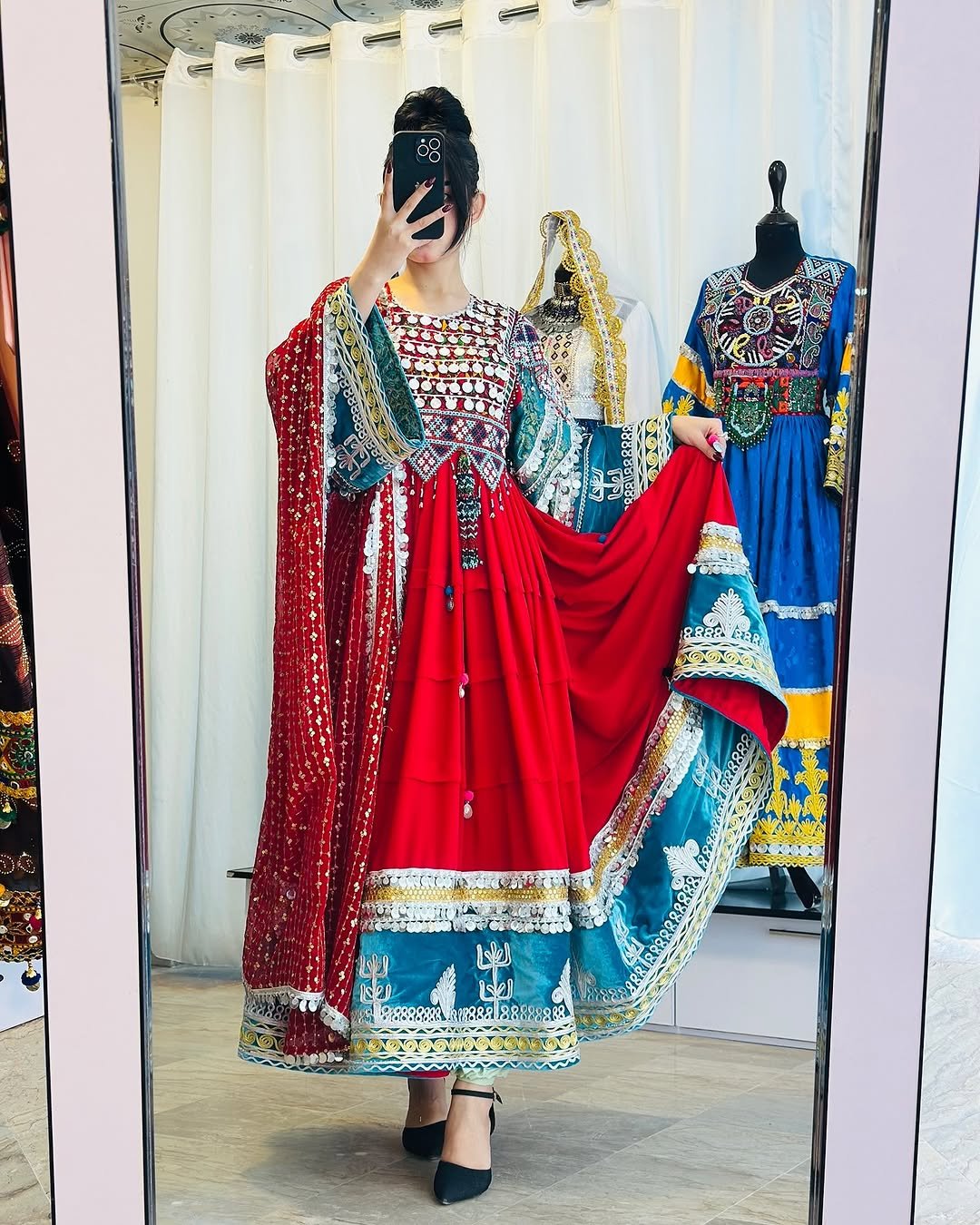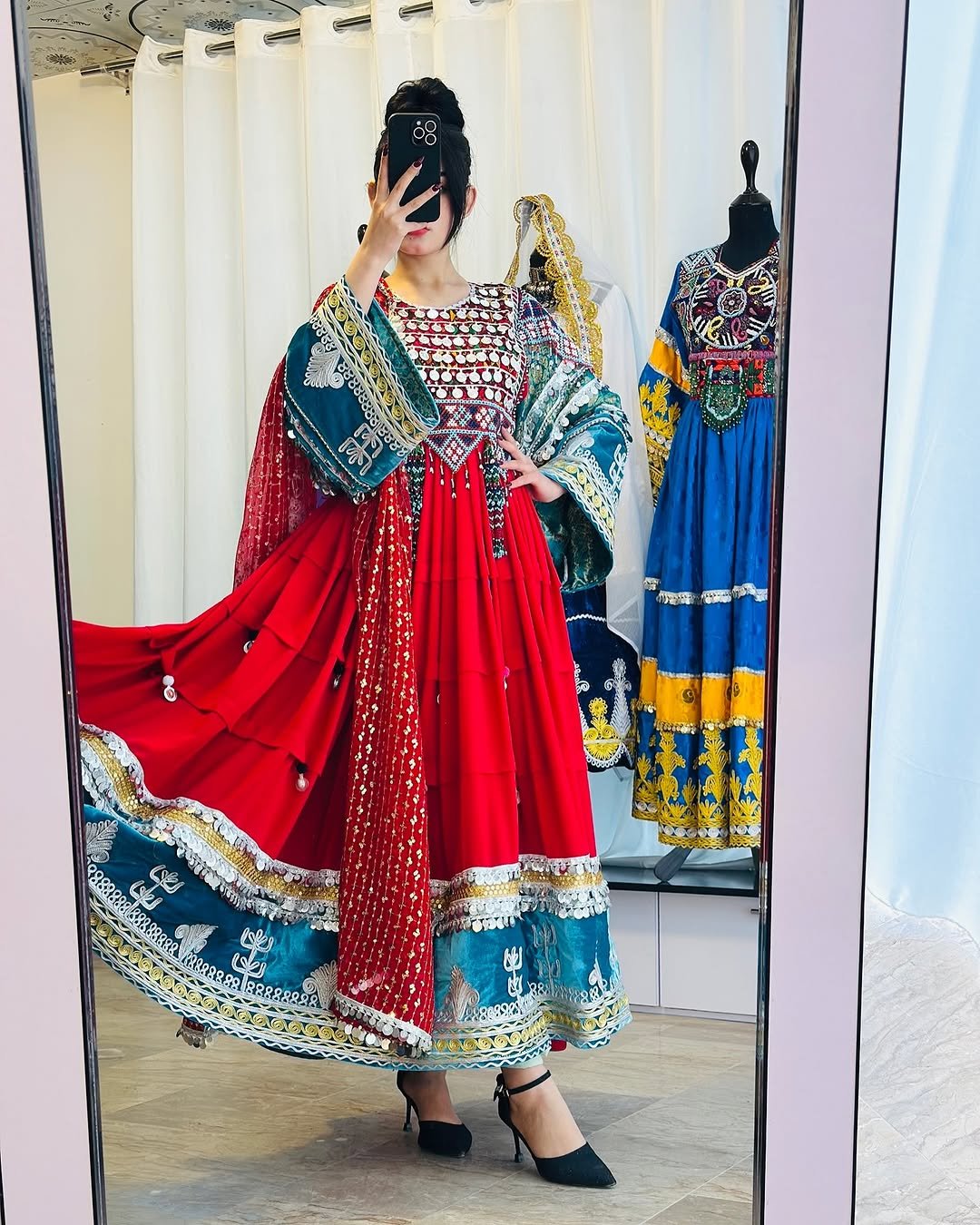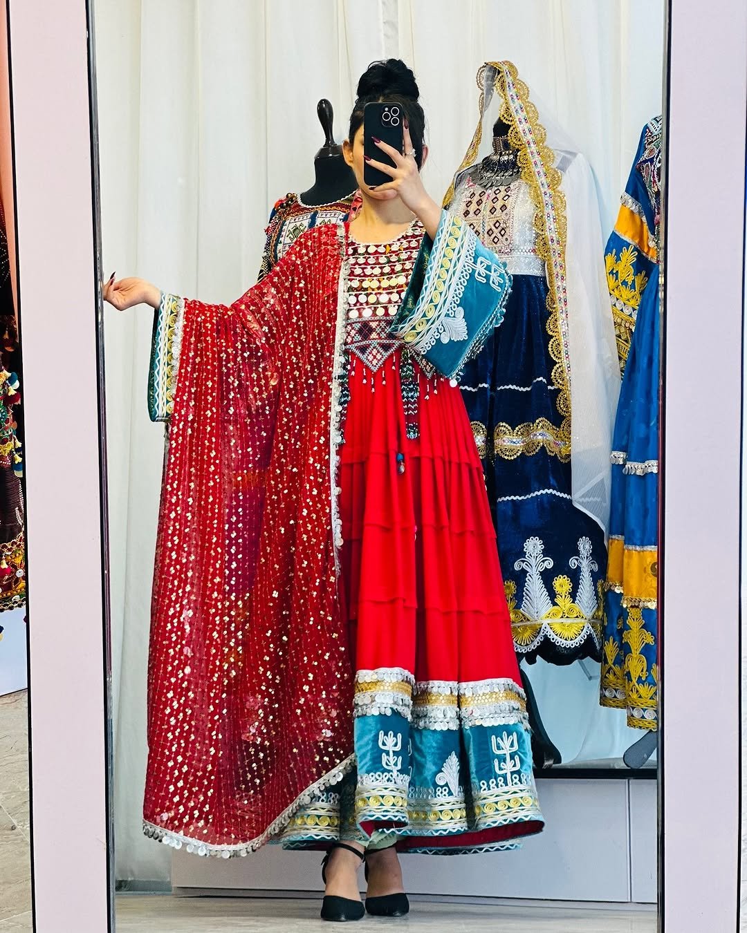 This stunning Afghan Red Trading Design Dress showcases the rich cultural heritage of Afghanistan with a modern touch. Crafted from high-quality fabric, it features intricate hand-embroidered patterns, traditional mirror work, and elegant golden or silver thread detailing. The vibrant red hue symbolizes passion and strength, making it a perfect choice for festive occasions, weddings, or cultural events. Designed for both comfort and sophistication, this dress blends timeless Afghan artistry with contemporary fashion, ensuring you stand out with grace and style.