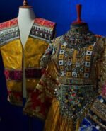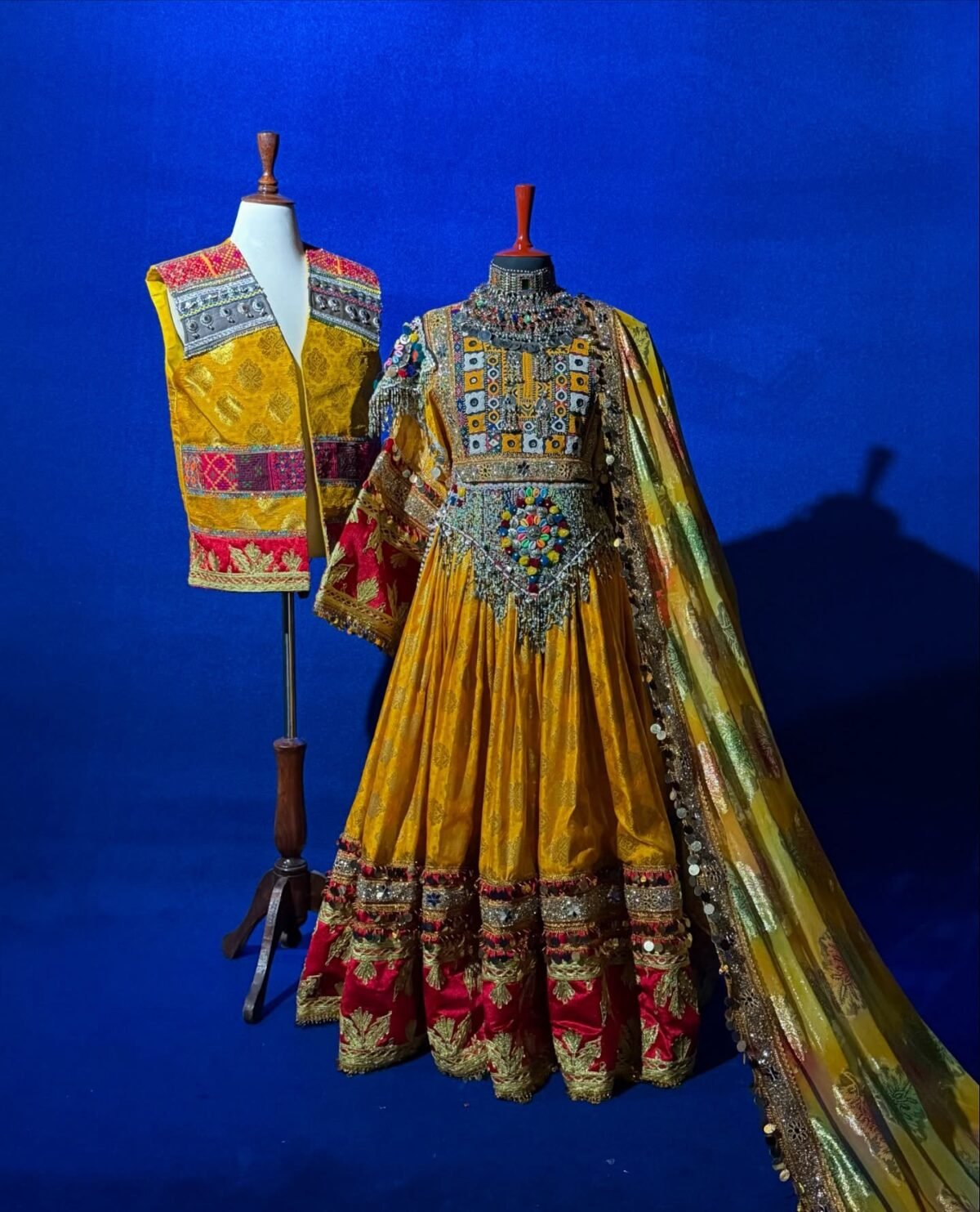 Paired with the bridal dress is a matching groom’s waistcoat, designed with complementary colors and patterns, creating a harmonious couple’s ensemble. This outfit is a perfect representation of Afghan wedding attire, showcasing the rich cultural legacy and timeless elegance of Afghan craftsmanship.