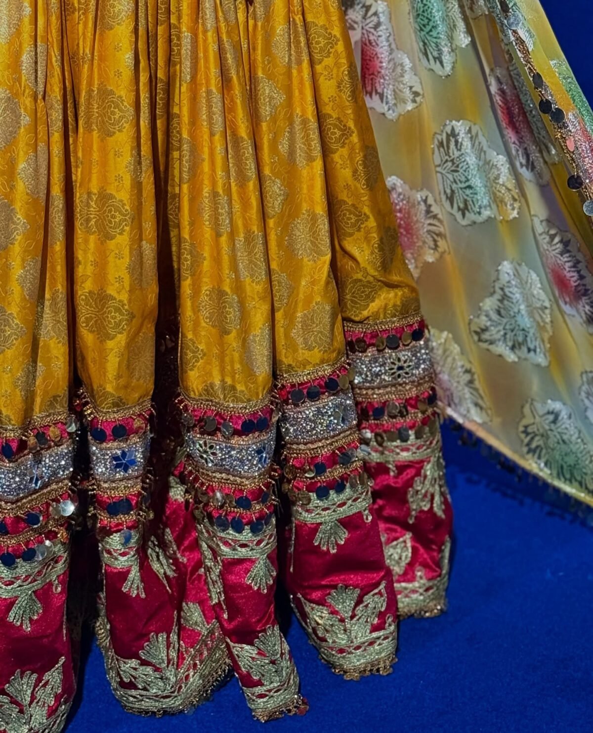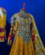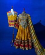 This stunning Afghan bridal dress is a masterpiece of traditional craftsmanship, featuring intricate mirror work, vibrant embroidery, and rich embellishments. The dress is predominantly golden yellow with striking red and multicolored accents, adorned with detailed beadwork and metallic thread embroidery. The long, flowing skirt and heavily decorated bodice reflect the beauty of Afghan heritage, while the sheer, embroidered dupatta adds an elegant touch.