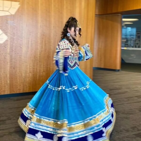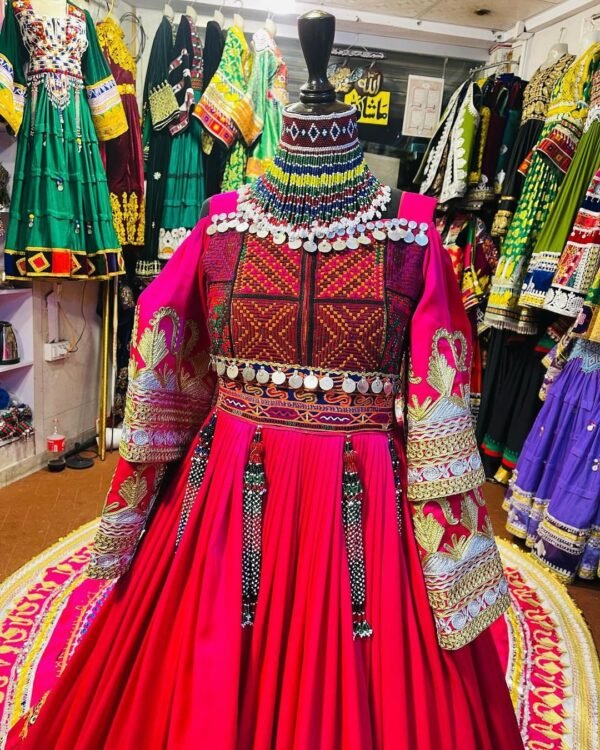 A modern-style Afghan dress blends traditional elements with contemporary fashion trends. It often features flowing silhouettes, vibrant colors, and intricate embroidery. These dresses may incorporate modern fabrics like chiffon, georgette, or silk, while still retaining traditional Afghan motifs and designs. They can be styled in various ways, from casual to formal, making them versatile and adaptable to different occasions.