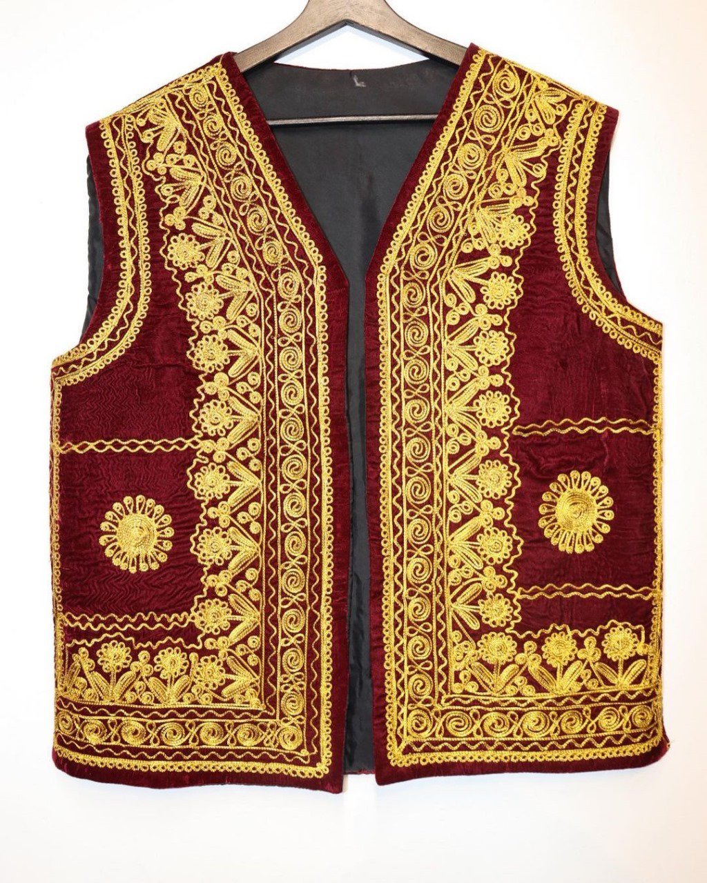 A Red Velvet Golden Dori Afghan Waistcoat is a traditional men’s waistcoat made from rich red velvet fabric and adorned with intricate golden embroidery, often featuring intricate patterns and motifs. It is a popular choice for special occasions and celebrations in Afghanistan and is known for its luxurious look and rich cultural heritage.