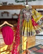 The Traditional Afghan Jama Dress is a stunning example of Afghanistan’s rich cultural heritage, often worn for special occasions such as weddings, festivals, and traditional celebrations. The “Jama” is a long, flowing robe with a fitted bodice and flared skirt, inspired by the royal attire of the Mughal era. It is typically adorned with intricate embroidery, mirror work, and vibrant colors, reflecting the diverse artistic traditions of Afghanistan.
